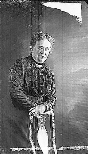 Porträtt av en kvinna som står lutad mot en stolsrygg..