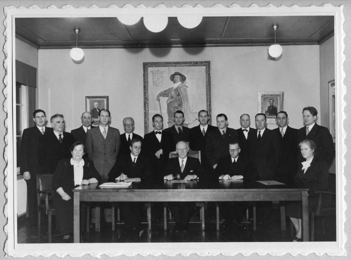 Gruppbild med 16 män och två kvinnor. Tre män flankerade av kvinnorna sitter vid ett bord, de andra står bakom dem. På väggen bakom hänger en portättmålning föreställande greve Per Brahe d.y., flankerad av mindre porträtt föreställande J G Granlund respektive Hjertströmfyra okända militärer.