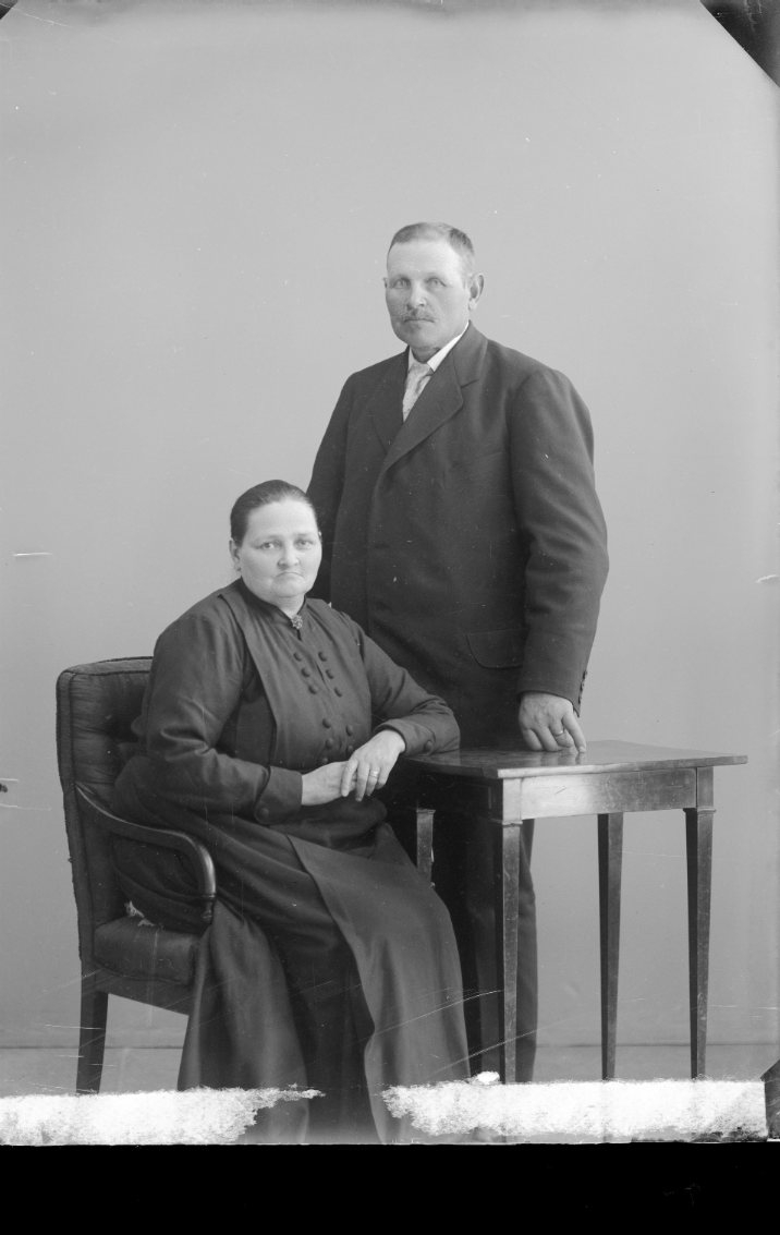 En kvinna sitter vid ett bord. En kraftig man står intill. Troligen ett par.
