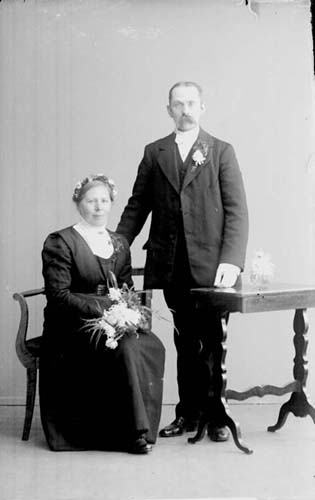 Ett brudpar, bruden i mörkt sitter i en stol med mannen stående bredvid.