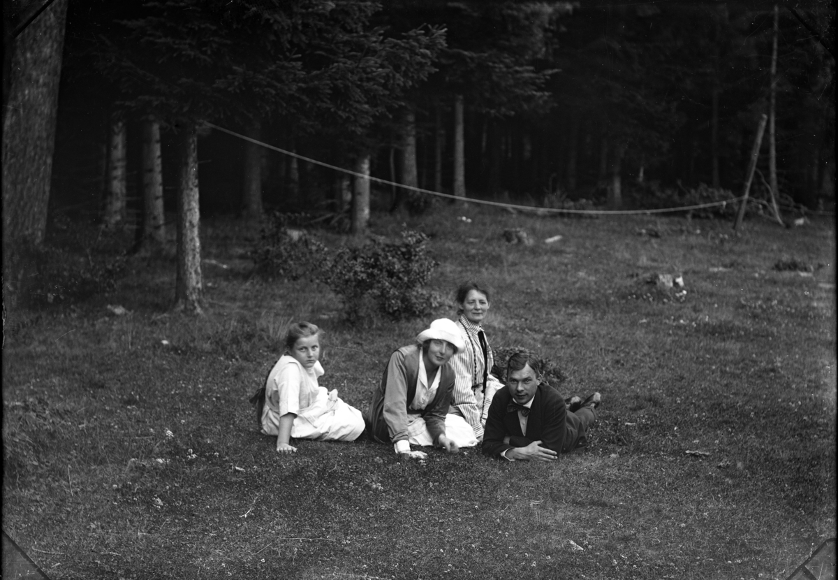 En flicka, två kvinnor och en man sitter respektive ligger i gräset. De är från vänster Birgit, hennes farmor Berta, faster Karin samt Gustaf Bolling.