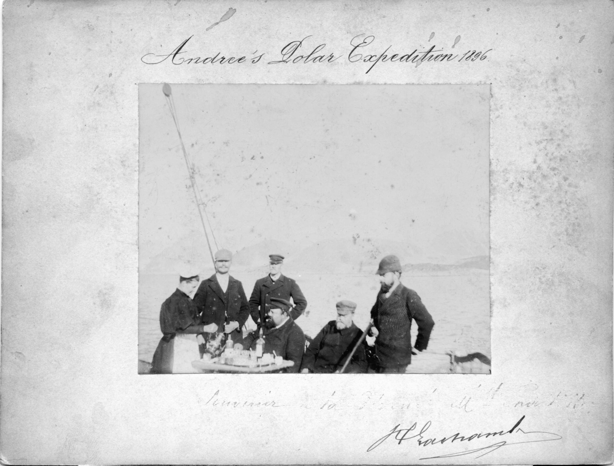 Kaffe och starkt på Virgos akterdäck: Charlotta Olsson, Strindberg, Ekelund och Grönberg. Sittande Zachau och Ekholm.
