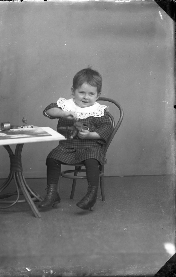 Porträtt av en liten pojke som sitter i en barnmöbel.