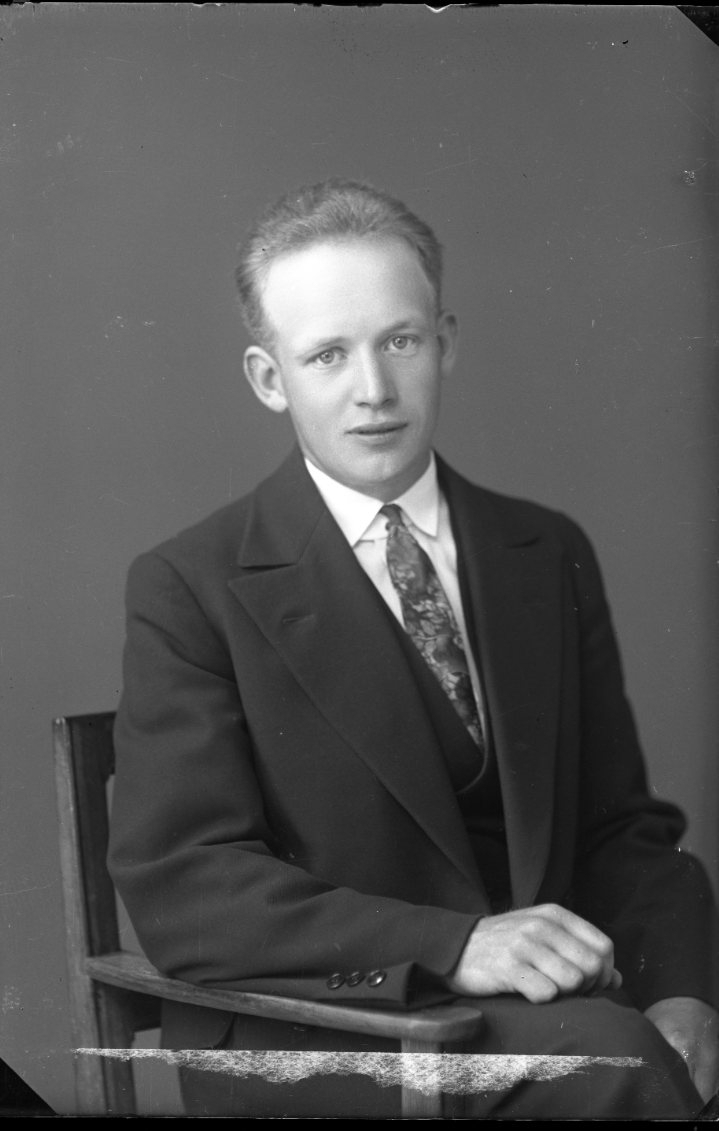 Titel: Porträtt av en sittande ung man i kostym och slips.