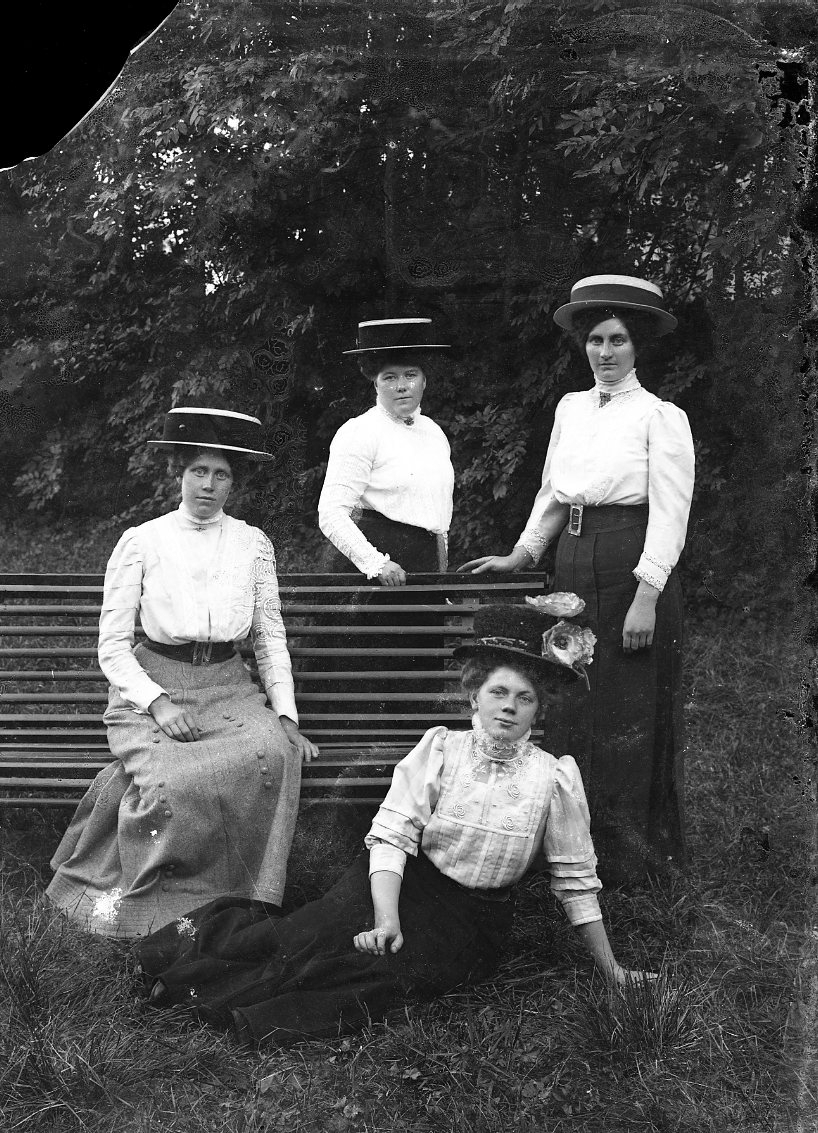 Fyra unga kvinnor med stora hattar samlad vid en bänk på en gräsmatta. En sitter på bänken, en sitter i gräset framför och de andra två står intill.