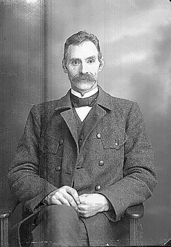 Snickarmästaren och snidaren Axel Johansson i kostym och kravatt sittande i en karmstol.