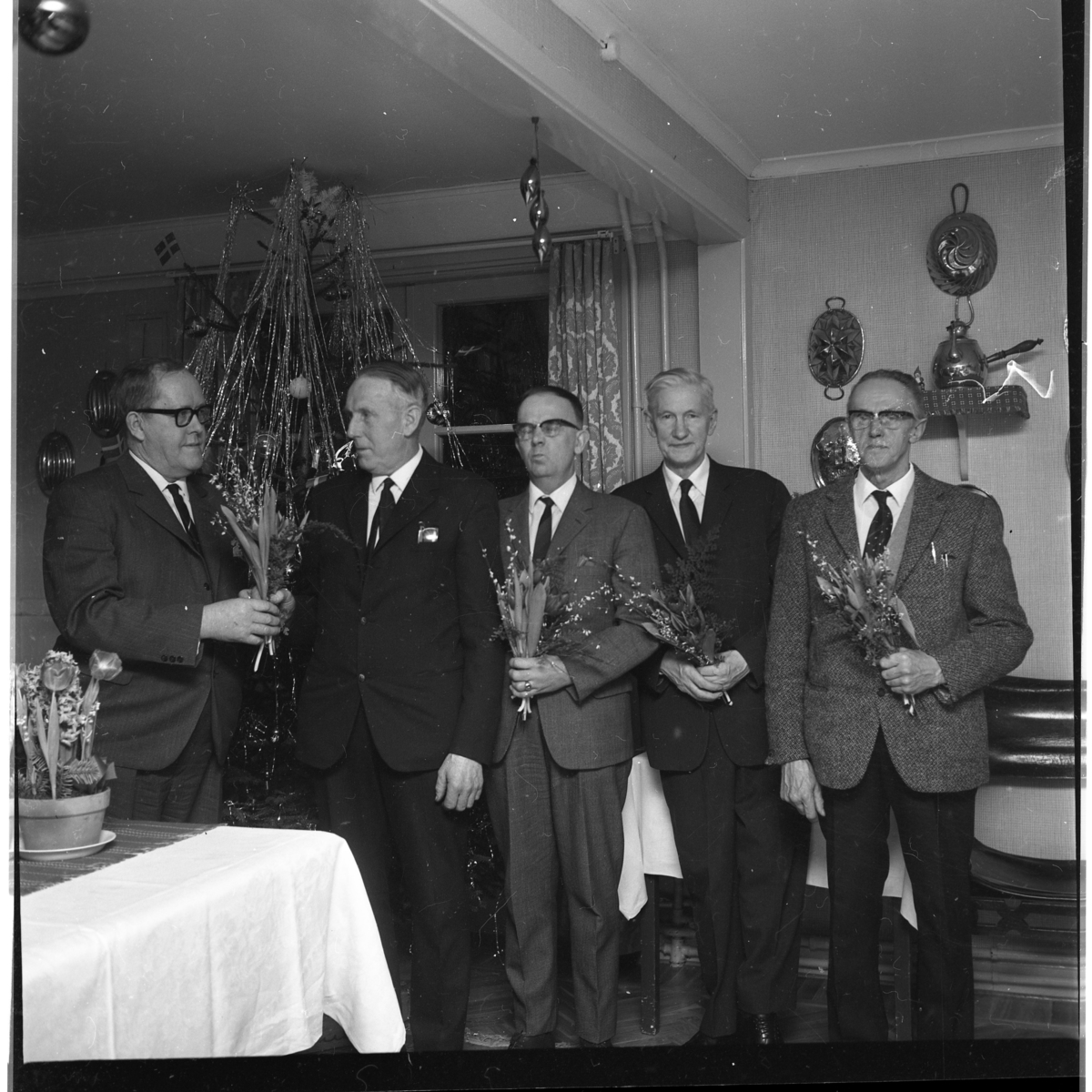 Titel: Avtackning av ledmöter i Skärstad kommunalnämnd. Kommunalnämndens ordförande Henry Larsson överlämnar blommor till Nils Syrén, Bertil Weinmer, Karl Boo och Ragnar Jarl. På bordet till vänster står en julgrupp med hyacint och bakom dem en julgran.