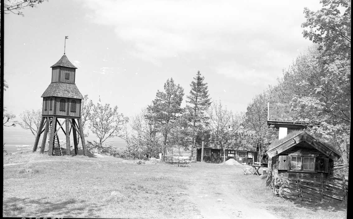 Friluftsmuseet på Grännaberget. En klockstapel till vänster, kaffestugan i mitten och pappersmakarbostället till höger.