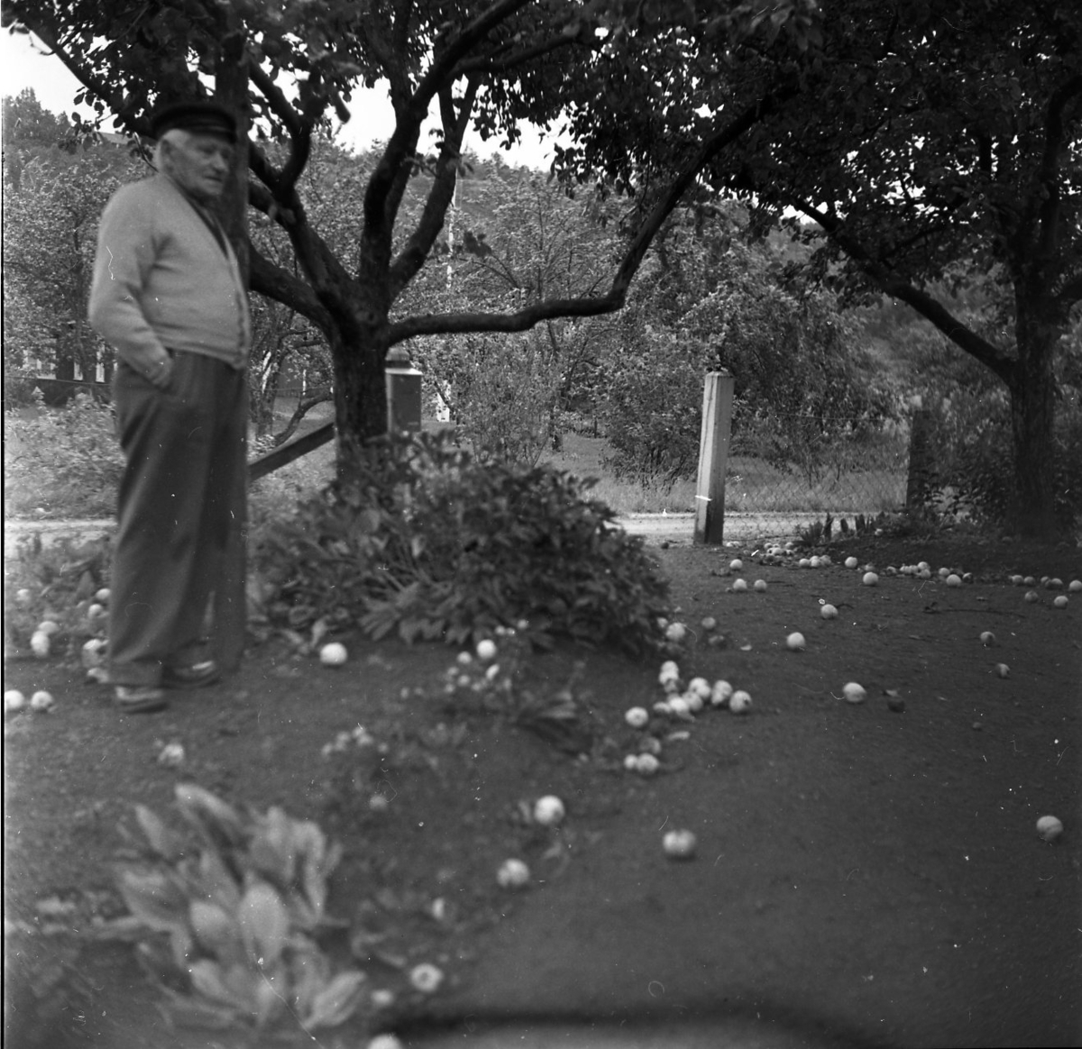 Ernst Stark med keps och ljus cardigan står i sin trädgård i Röttle. Det ligger mycket fallfrukt på gräsmattan.