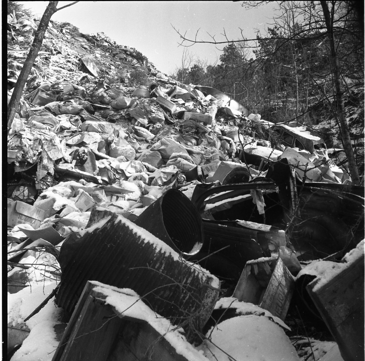 En slänt är täckt med hushållssopor. Även en gammal bil och en husvagn är dumpade på platsen.