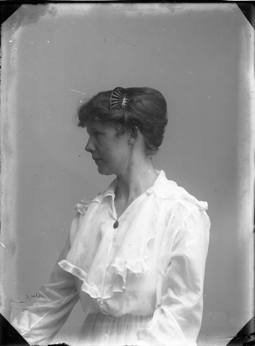 Porträtt av Karin Rythén, bröstbild i profil. Hon sitter i ljus klädsel med hårspänne.