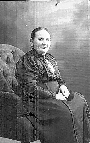 Porträtt av en kvinna som sitter i en fåtölj med händerna i knät.