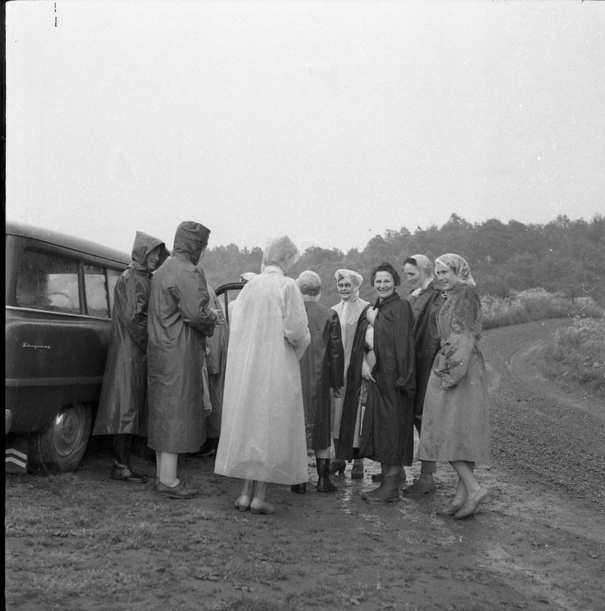 En grupp kvinnor i regnkläder står vid en bil med höger dörr öppen. Det regnar.