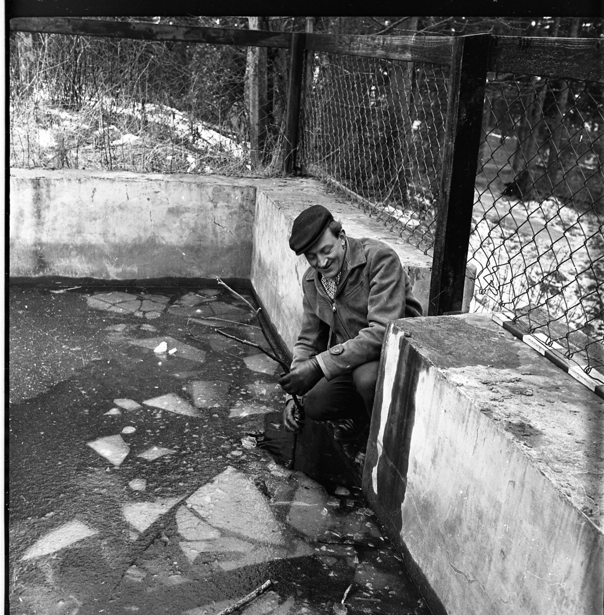En herre sitter vid en vattenfylld betongpool. Han håller en pinne i händerna. Betongpoolen är inhängnad med hönsnät. Vattnet är fruset.