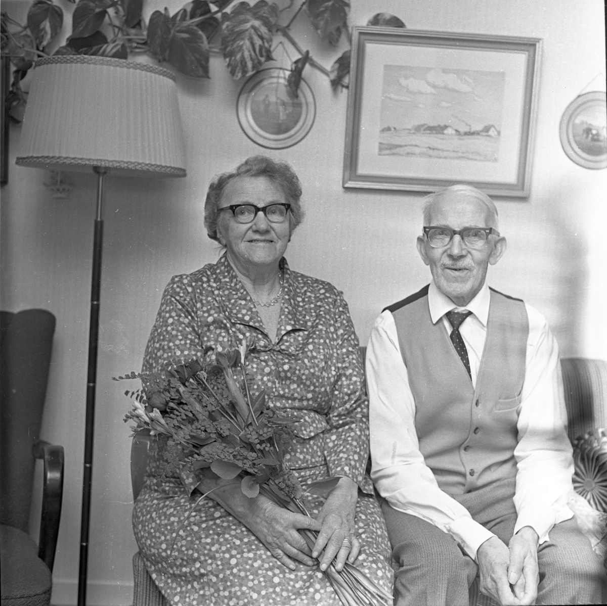 Ett äldre par sitter i en soffa, kvinnan har en blomsterbukett i famnen. De firar guldbröllop.