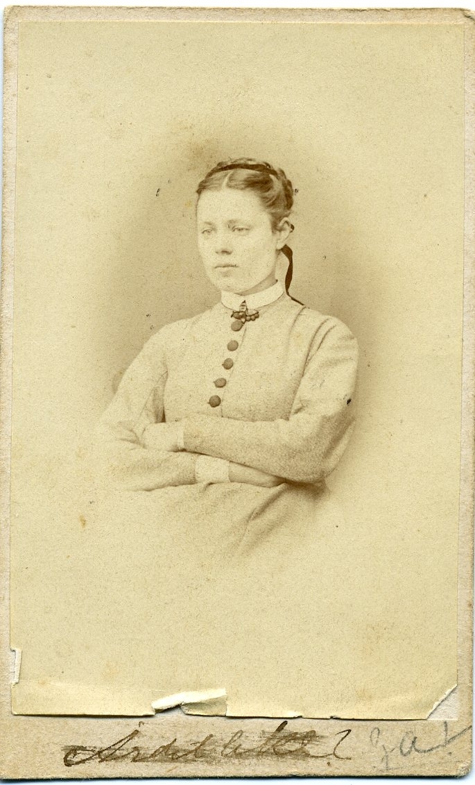 Kabinettsfotografi: porträtt av okänd kvinna som sitter på en stol.