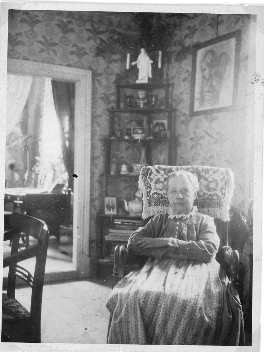 En kvinna sitter i en stol i sitt hem med armarna i kors. Hon bär en klänning med randigt/mönstrat förkläde. Över stolsryggen hänger en antimakass i spets.