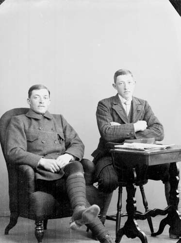 Bröderna Carlsson. Två sittande unga män, Elfin till vänster i en fåtölj och Gunnar på en stol med armarna lutade på ett bord.