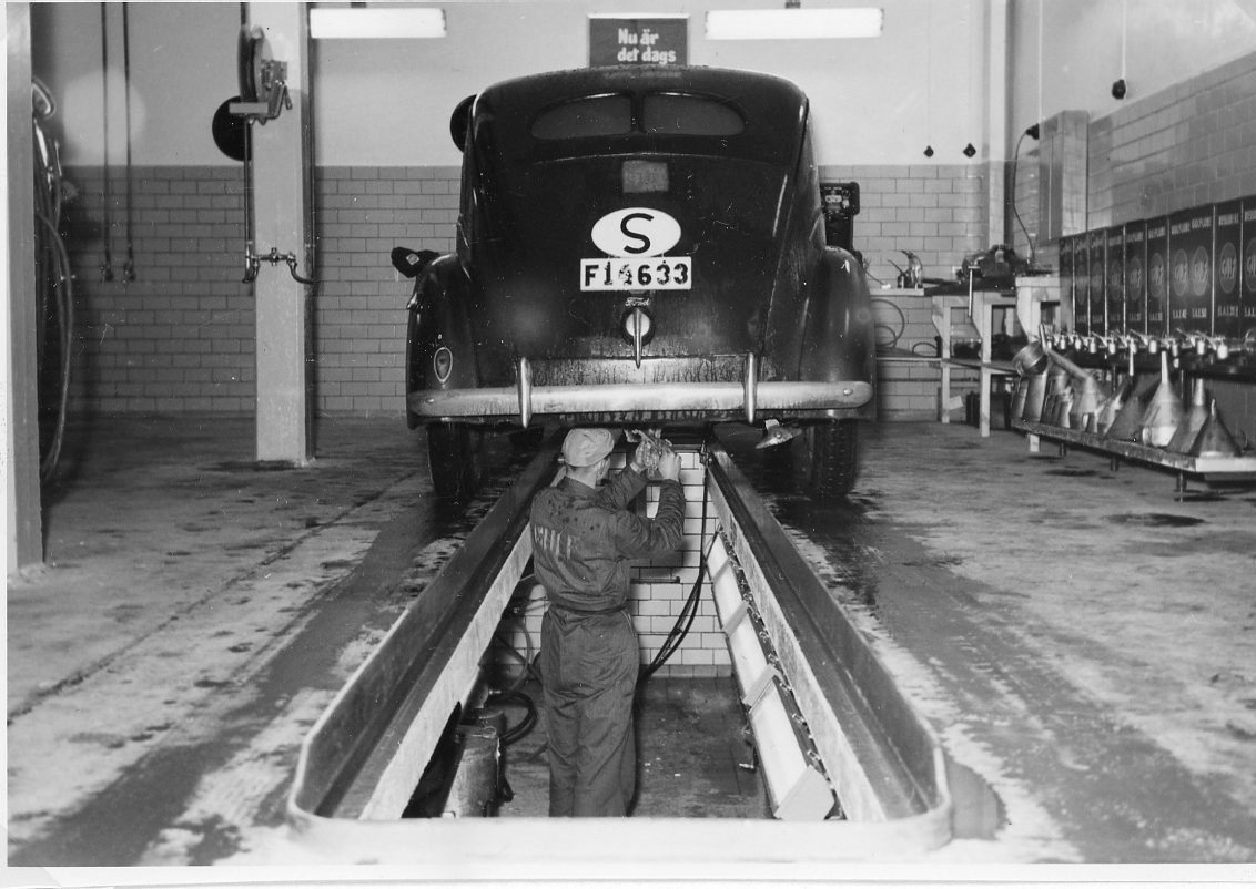 En man i overall står i en smörjgrop under en bil av okänt märke - registreringsnummer F14633.