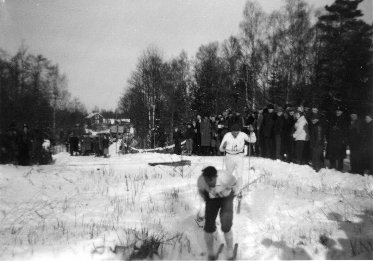 Skidåkare kämpar sig uppför en backe, troligen i samband med Braheloppet.
