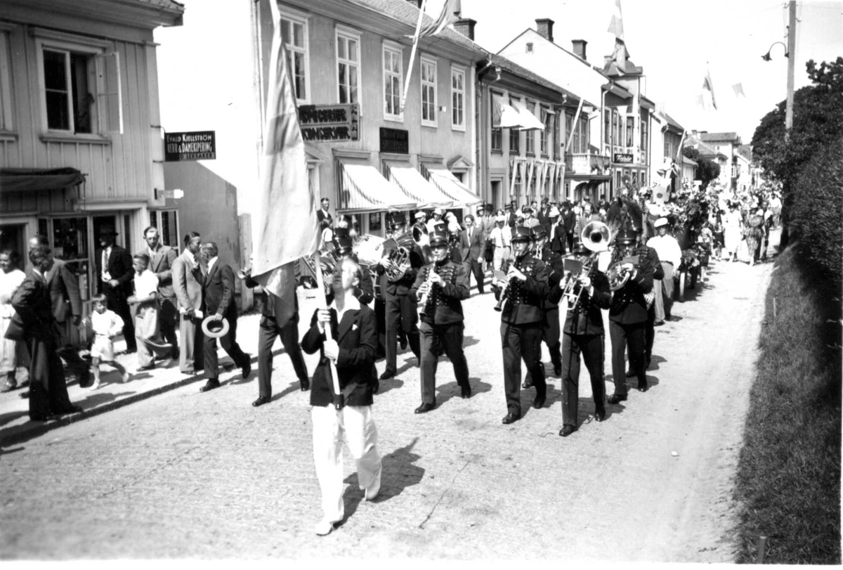 Kortege med fanbärare, A6 musikkår och lövad flakvagn på Brahegatan i Gränna.