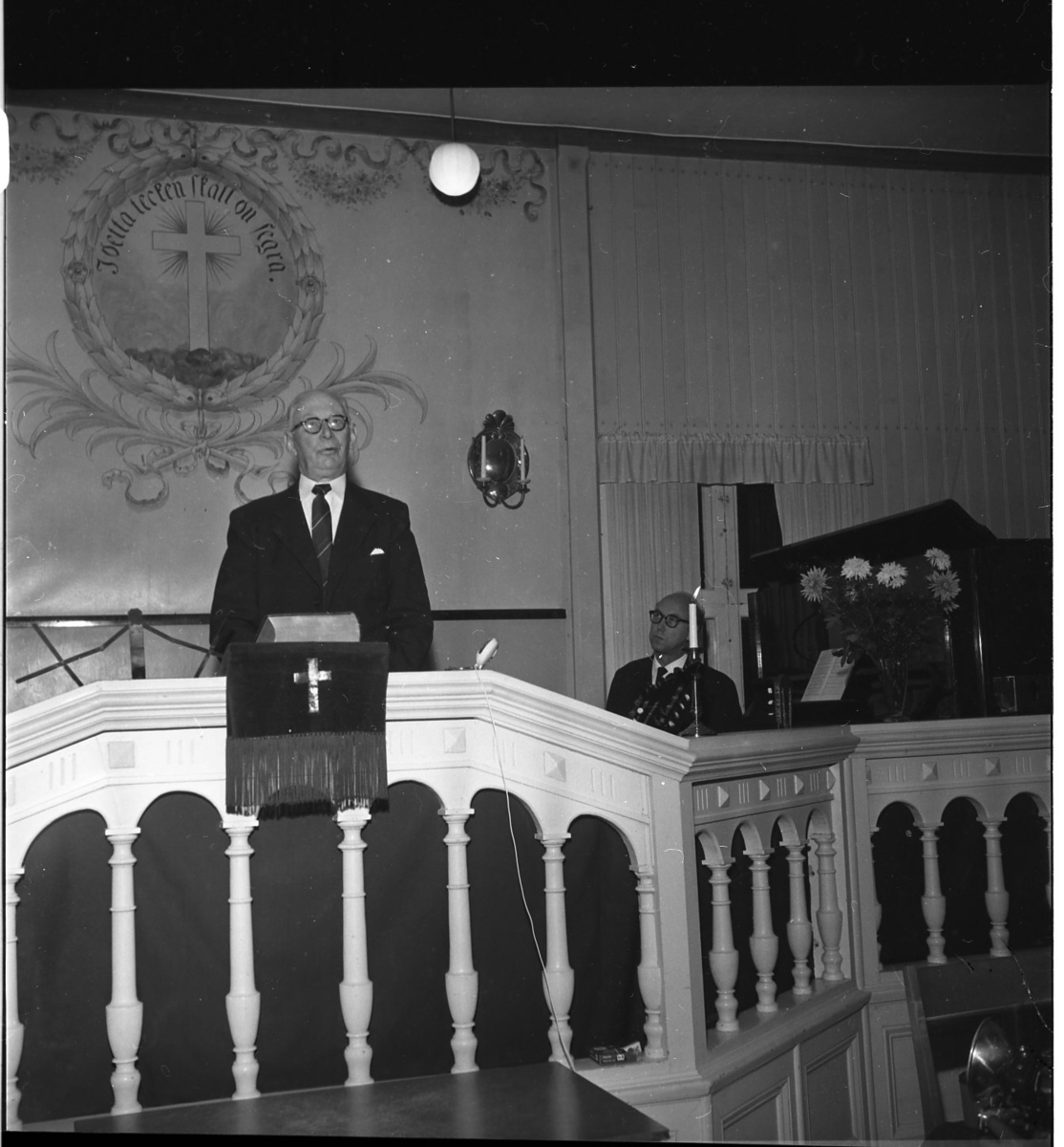 En man står vid en talarstol i en kyrka. Bakom honom är en väggmålning föreställande ett kors. Bredvid talarstolen sitter en man och lyssnar.