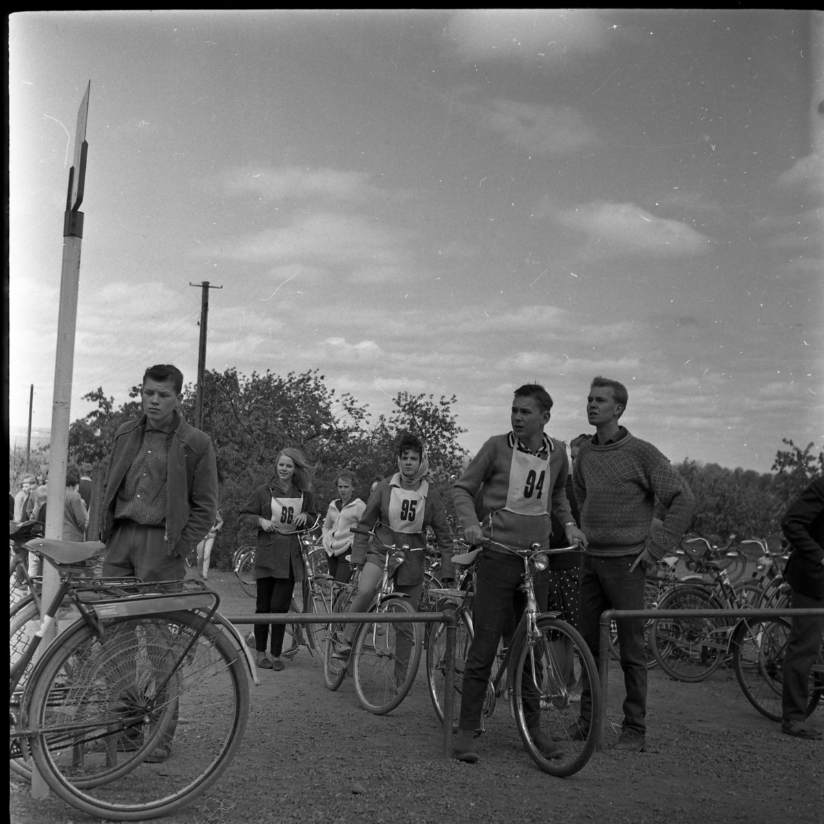 Människor står bredvid cyklar och pratar. Några bär nummer utanpå sina kläder.