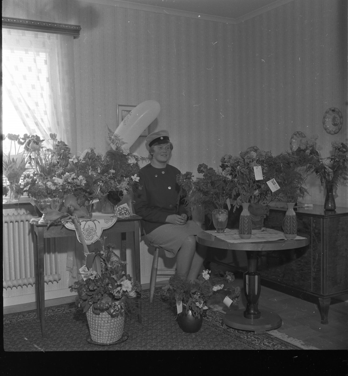 Realskolebilder Nyarp 1961. En kvinna sitter på en stol omgiven av blommor. Hon bär studentmössa och ser glad ut.