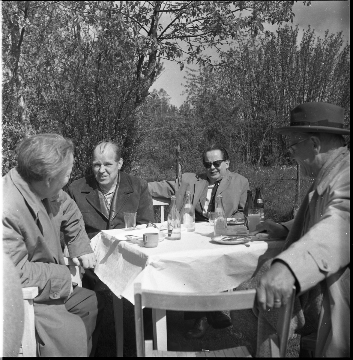 Fyra män sitter i en trädgårdsmöbel. Kaffekoppar och läskedrycksflaskor på bordet.