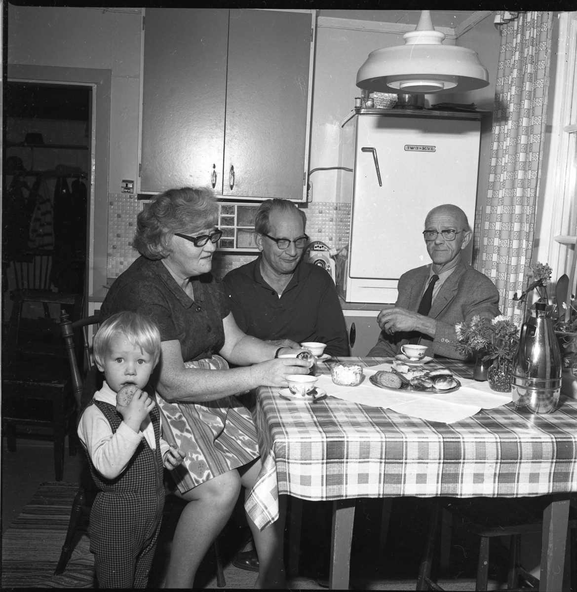 En kvinna och två män sitter vid ett kaffebord i ett kök, en liten pojke står till vänster.