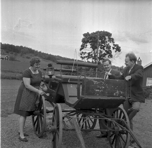 Titel: Tre personer står vid en hästvagn. En kvinna målar vagnen vars färg har flagnat.