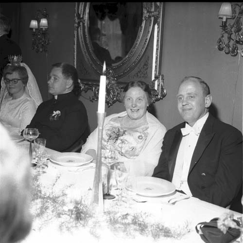Ett brudpar sitter vid ett uppdukad bord. Brudens mor sitter och ler mot gästerna.
