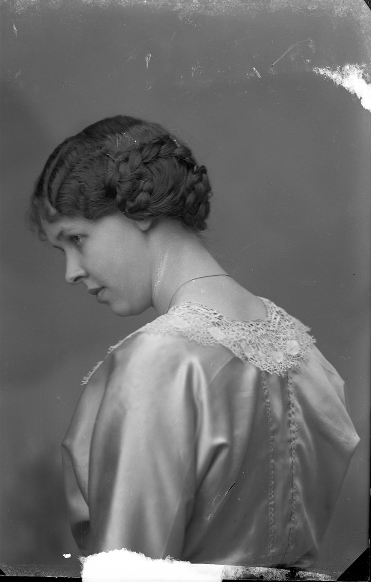 Porträtt av en kvinna fotograferad snett bakifrån, hon tittar nedåt.