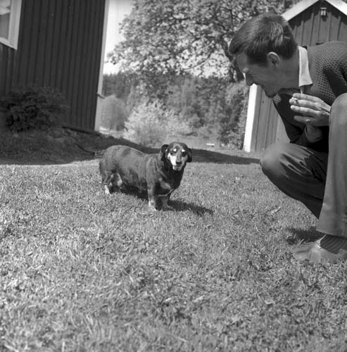 En hund står på gräsmattan och tittar mot fotografen. Bredvid hunden sitter en man på huk och tittar på hunden.