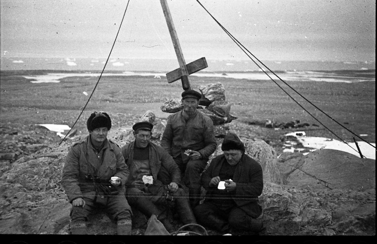 Fika vid Horns varde som markerar fyndplatsen av Andréelägret på Vitön. Stubbendorff till vänster.