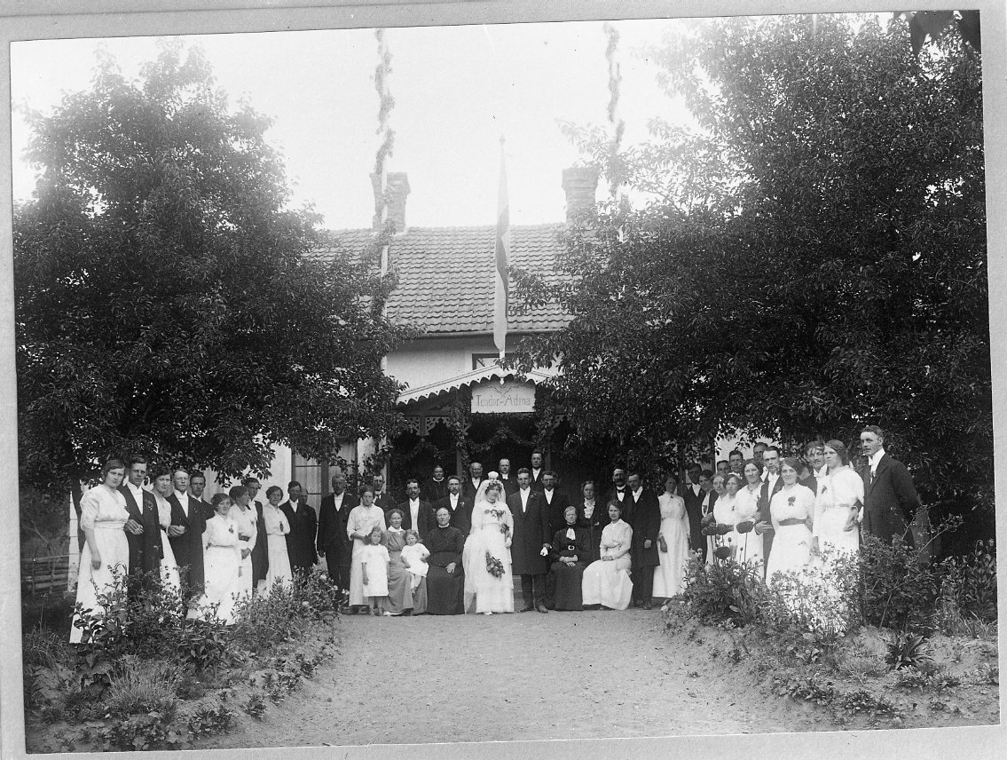 Ett bröllopssällskap uppställda framför ett hus. Dekorerad farstu och en skylt med namnen "Teodor Adina". Brudparet står under densamma.
