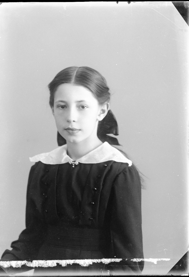 Porträtt av en flicka i mörk klänning och vit spetskrage. Sannolikt konfirmationsbild.