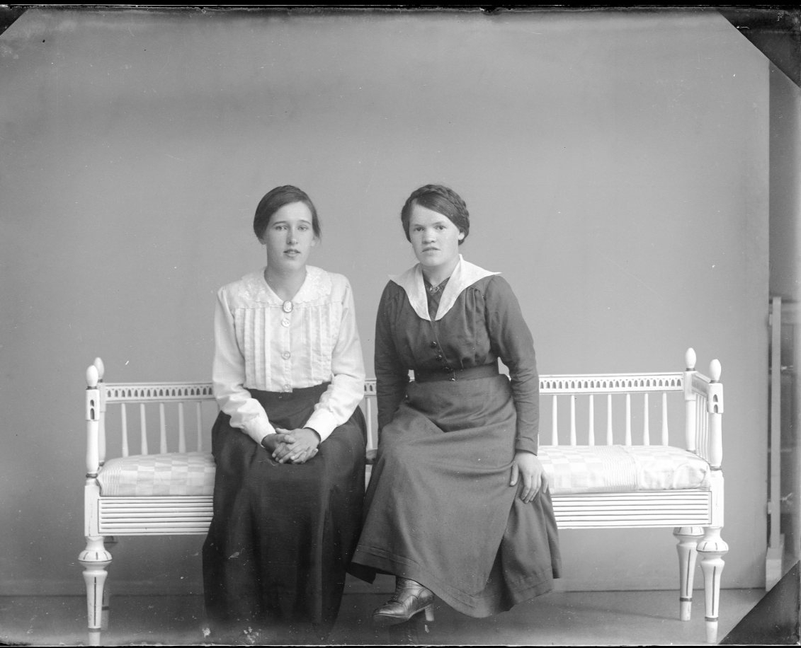 Porträtt av två unga kvinnor som sitter på en soffa i gustaviansk stil.