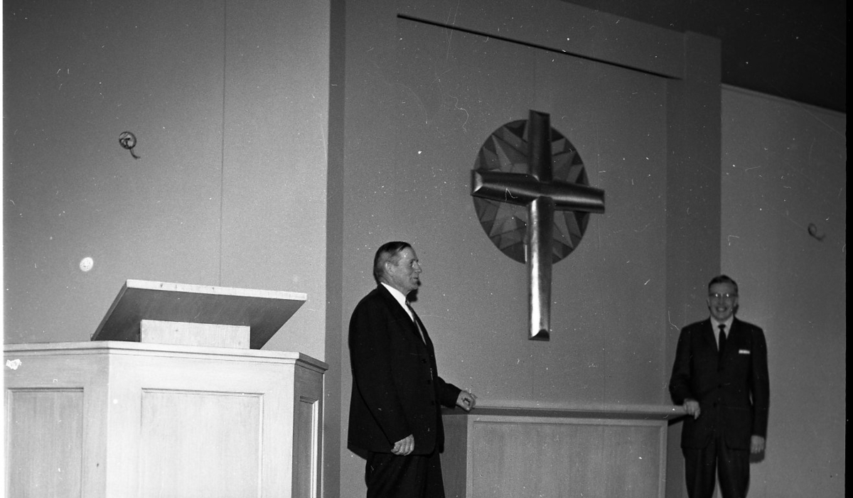 Två män står bredvid ett altare. På väggen över altaret hänger ett kors.