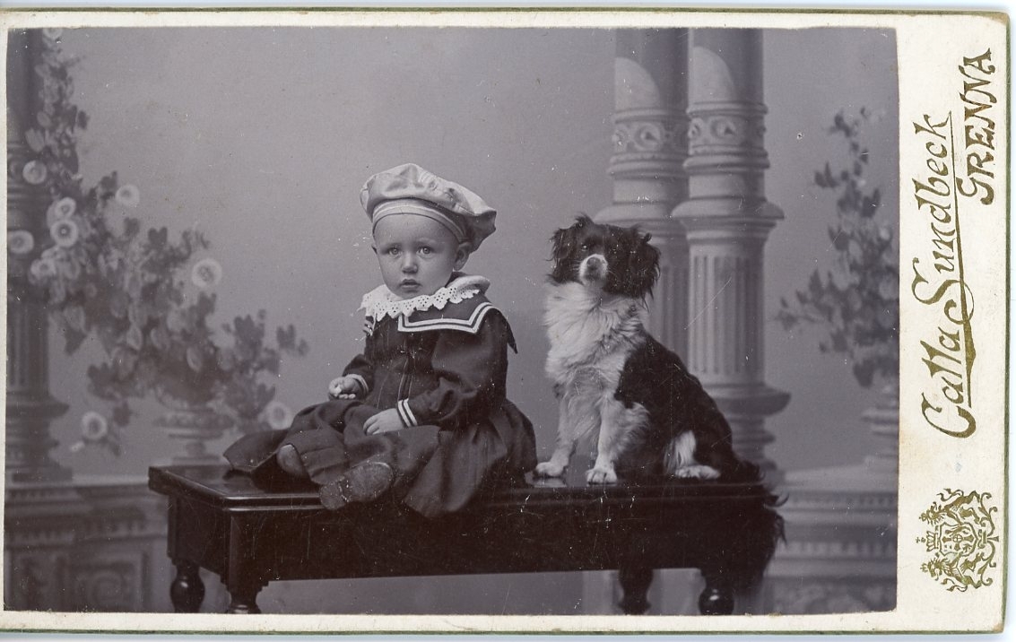 Kabinettsfotografi av ett späbarn och en hund som sitter på ett bord.