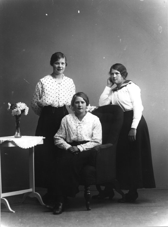 Tre flickor i övre tonåren. En sitter i en fåtölj vid ett bord med duk och blommor i en vas. Den andra står bakom.