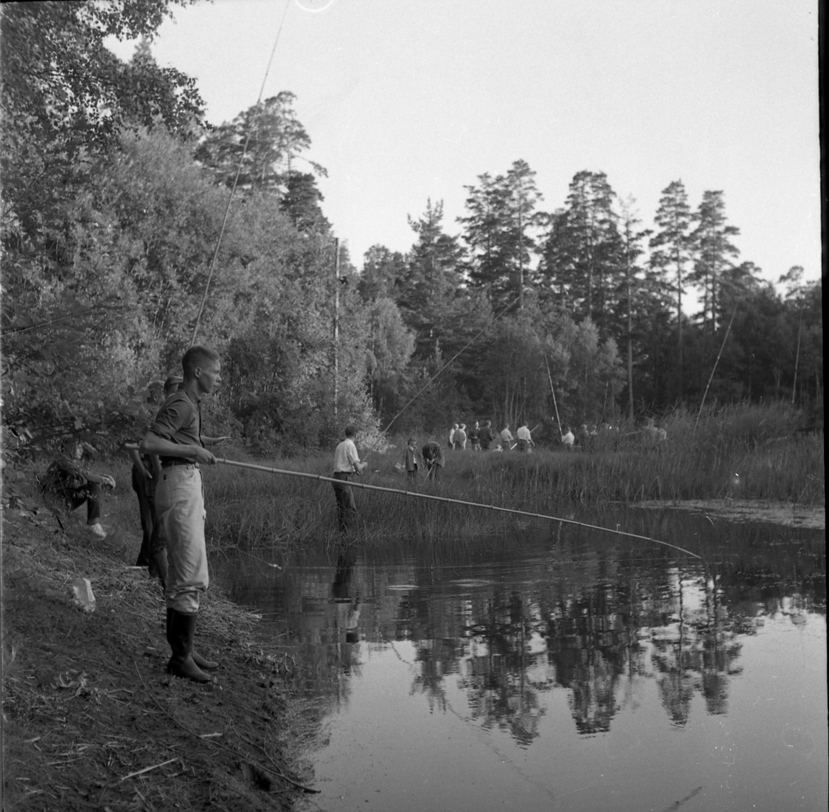 Barn och vuxna står vid en strand och metar.