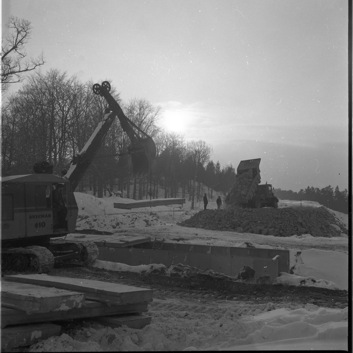Grävskopa och lastbil i arbete i samband med motorvägsbygget vid Gränna/Röttle, etapp II. Lite snö på marken.