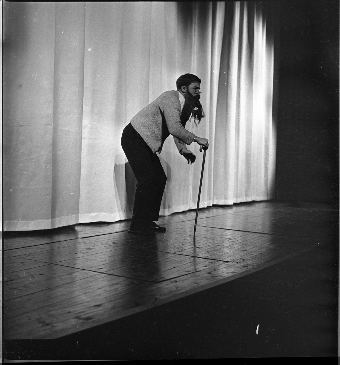 En krokig man med käpp och lösskägg repeterar för en nyårsrevy.