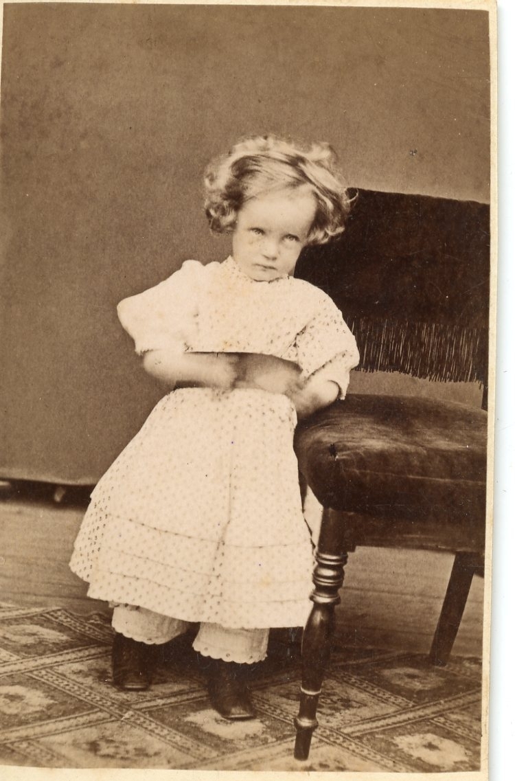 Kabinettsfotografi av ett litet okänt barn som står vid en stol.