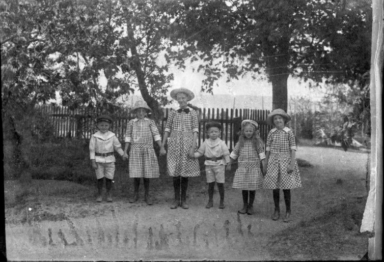 Sex barn står hand i hand på en grusplan, troligen på en tomt.
