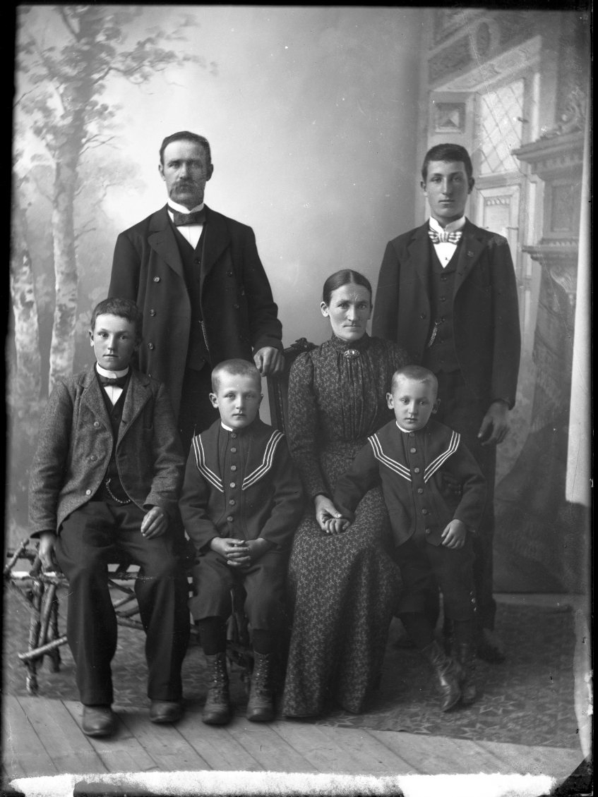 Gruppbild med man, kvinna och fyra pojkar. Familjen Otto Forsander, Visingsö