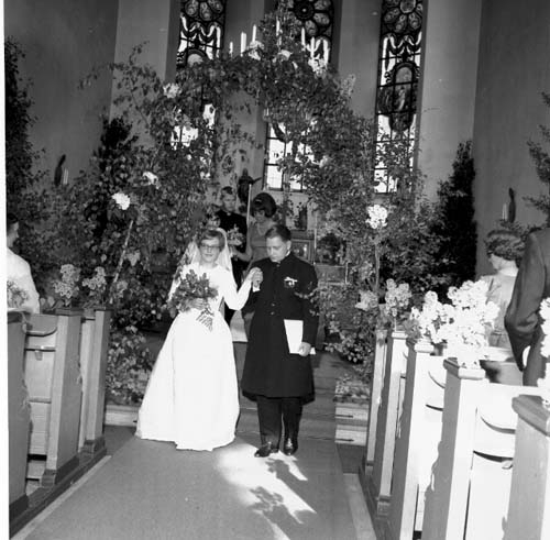 Ett brudpar står i en altargång under en blomsterportal. De håller varandra i händerna.