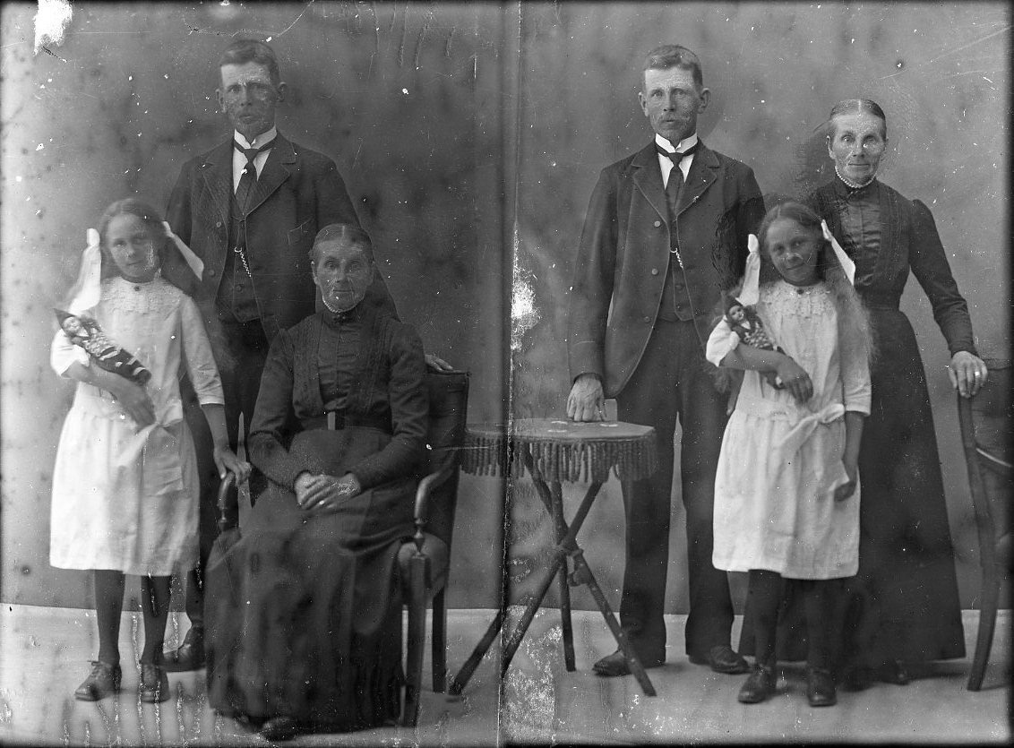 En man, en kvinna och en flicka. Flickan har en docka i famnen. Två bilder på samma glasplåt.