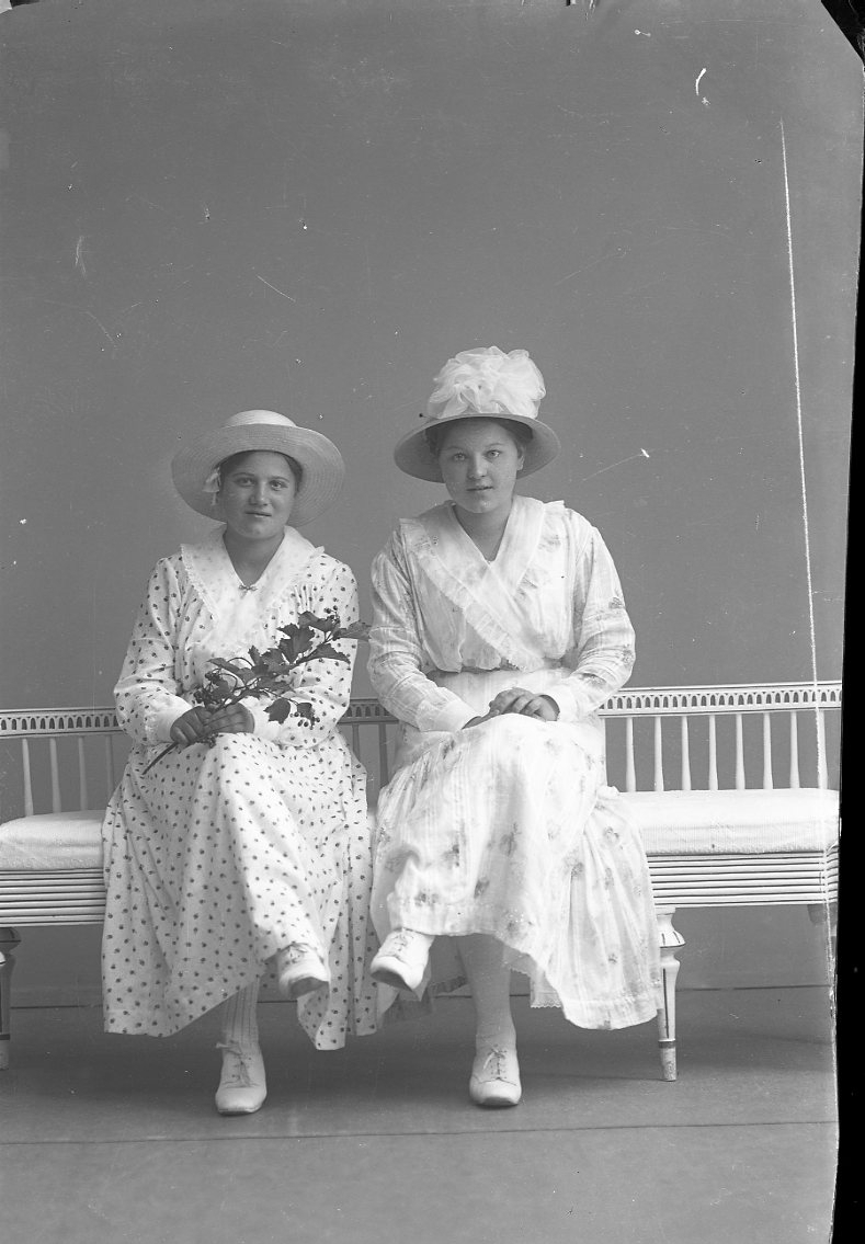 Två unga kvinnor i ljusa klänningar och hatt sitter i en soffa i gustaviansk stil. En kvinna håller en kvist i sin hand. En av dem är Anna-Lisa Hörlin, gift Lundin.